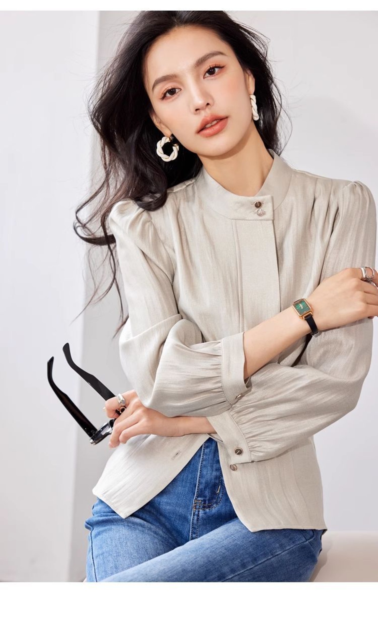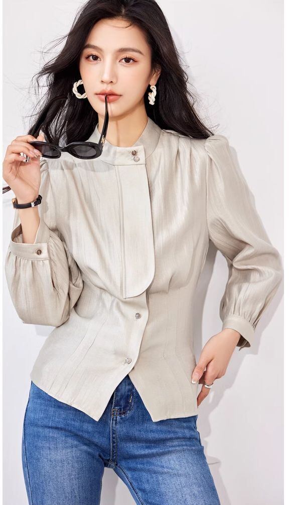 ベージュカラーのスタンドカラー長袖シャツブラウス。