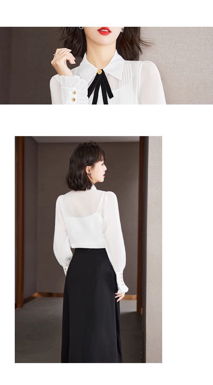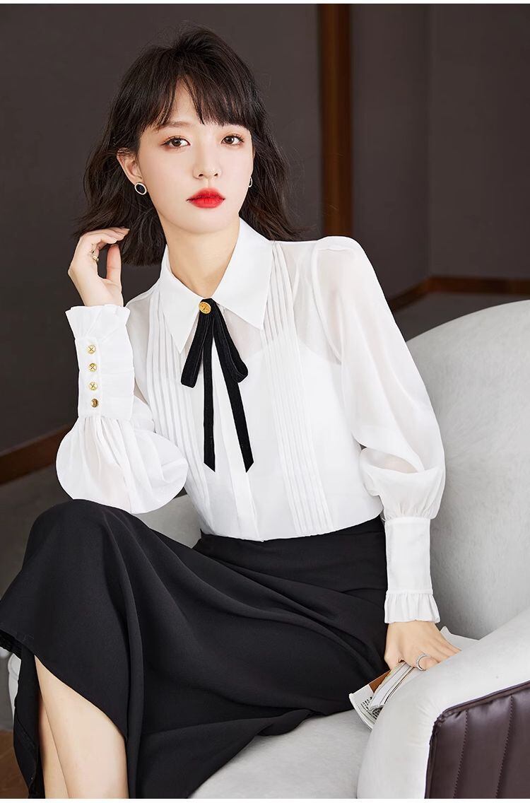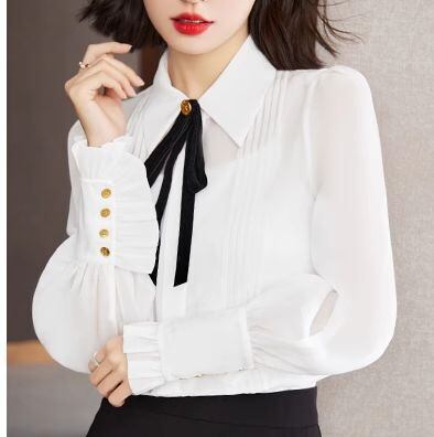 ホワイトカラーのリボン付き長袖シャツブラウス。