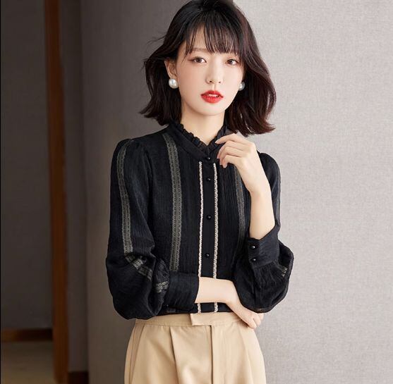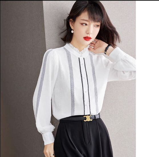 2色カラバリ、フリルスタンドカラーレースシャツブラウス。