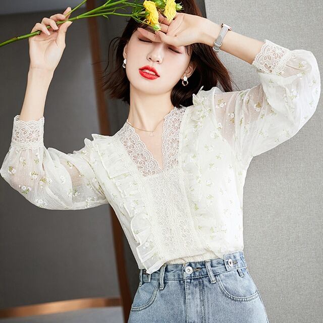 トップス レディース ブラウス プルオーバー 長袖 Vネック レース フリル ふんわり 透け感 大人可愛い きれいめ 大人 上品 おしゃれ お洒落 ガーリー キュート ラブリー ナチュラル 爽やか エレガント フェミニン 大人女子 存在感 抜け感 こなれ感 S M L XL 2XL 大きいサイズ 白 アイボリー 花柄 フラワー 春 夏 秋 10代 20代 30代 40代 50代 60代 学生 通学 女子会 お出かけ デート リゾート 休日 旅行 普段使い デイリー 着回し 韓国 オルチャン