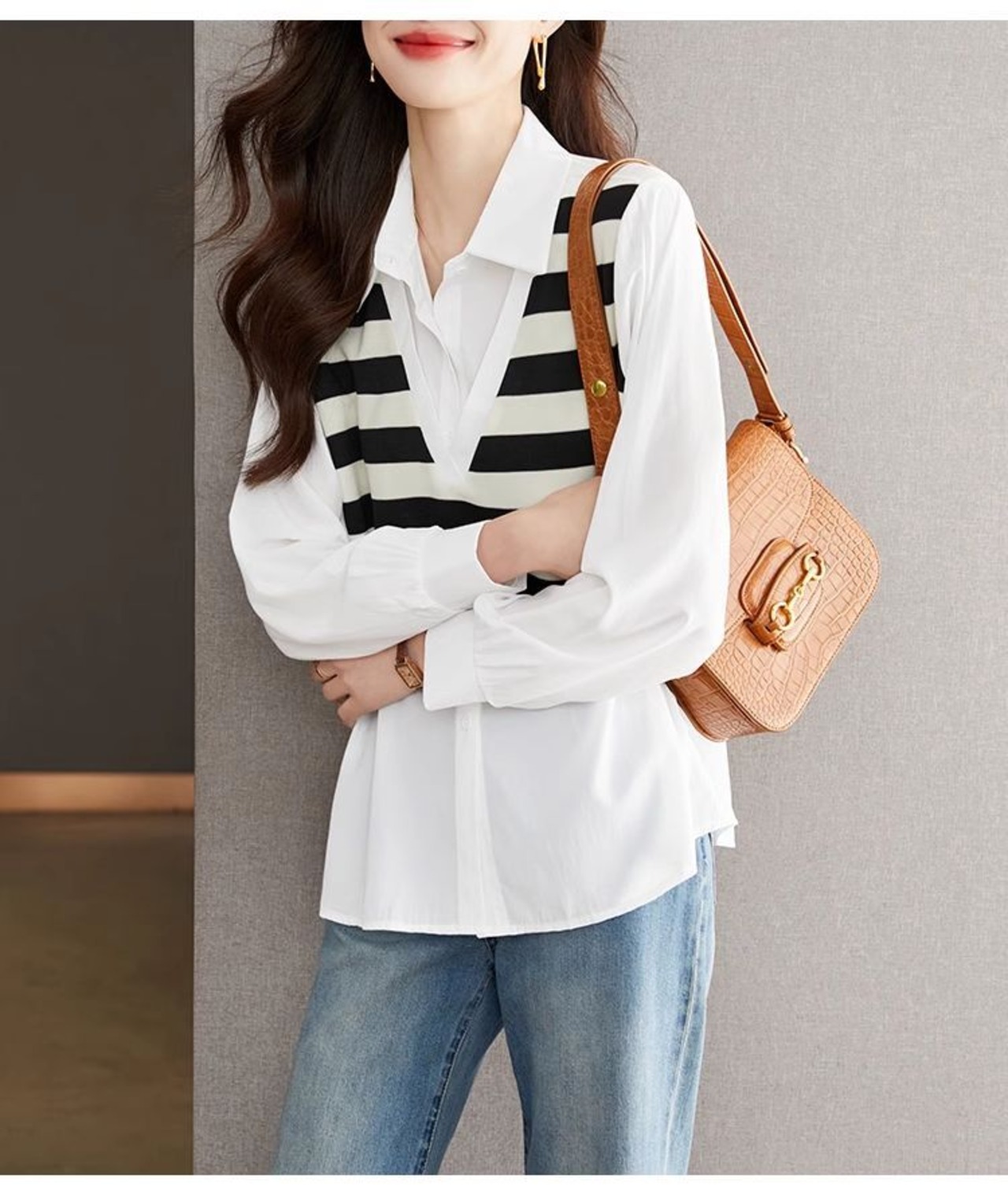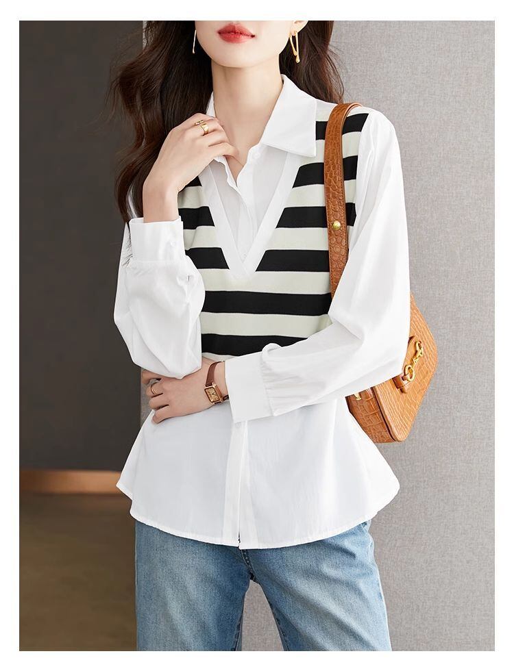 ホワイトシャツにボーダーベストを重ね着したような長袖プルオーバーブラウス。