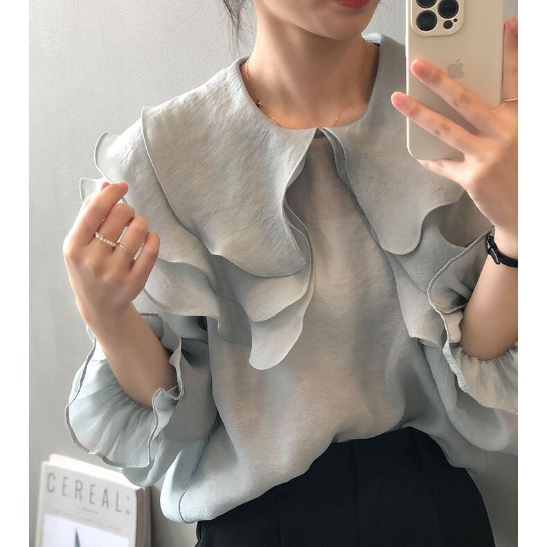 トップス レディース シフォンブラウス プルオーバー 長袖 フリルカラー 襟付き ラッフルカラー キャンディスリーブ ふんわり 透け感 大人可愛い きれいめ 大人 上品 おしゃれ お洒落 ガーリー キュート ラブリー 清楚 エレガント フェミニン 大人女子 存在感 抜け感 こなれ感 M L 白 アイボリー 水色 ブルー 無地 春 秋 10代 20代 30代 40代 50代 オフィス OL 通勤 学生 通学 女子会 お出かけ デート リゾート 休日 旅行 普段使い デイリー 韓国 オルチャン