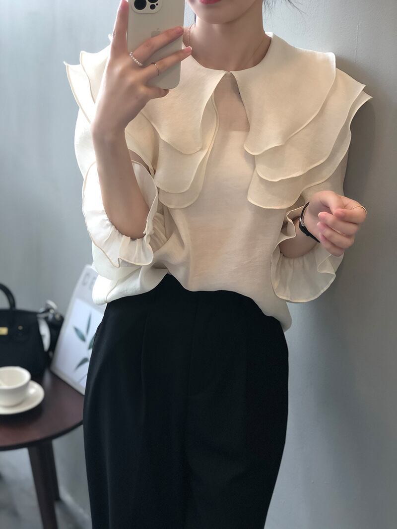 2色カラバリ、ラッフルカラー長袖シフォンブラウス。