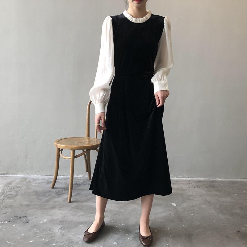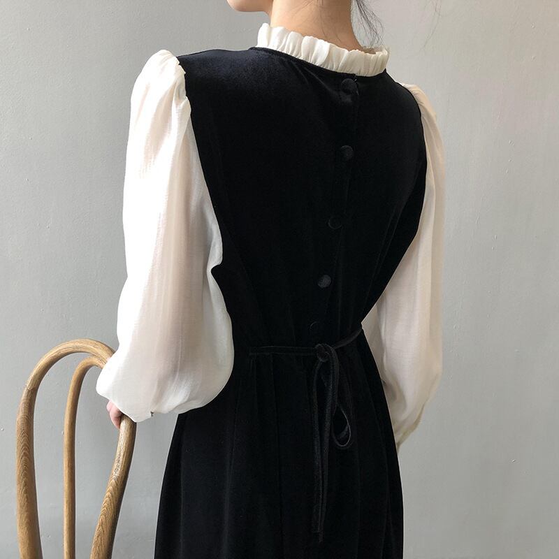 ワンピース レディース ワンピース ミモレ丈 ドッキング 切り替えデザイン 重ね着風 レイヤード風 スタンドカラー 立襟 ジャンパースカート 長袖 パフスリーブ セミフレア シフォン 透け感 ベロア調 別珍 ベルベット調 大人可愛い きれいめ 大人 上品 おしゃれ お洒落 大人女子 レトロ エレガント フェミニン シック 存在感 こなれ感 抜け感 M L 黒 ブラック 白 ホワイト 無地 春 秋 10代 20代 30代 40代 50代 60代 オフィス OL 通勤 学生 通学 デート お出かけ 女子会