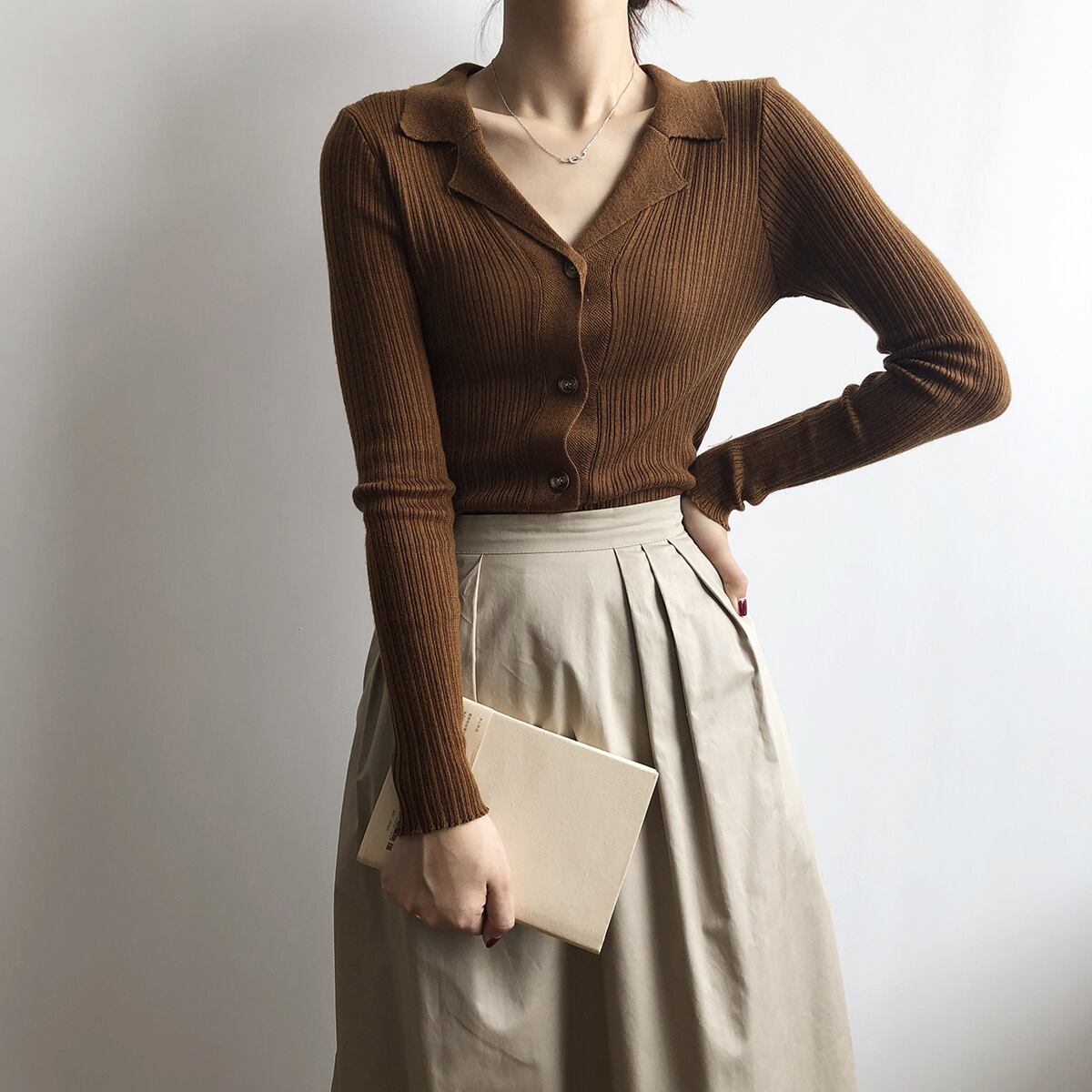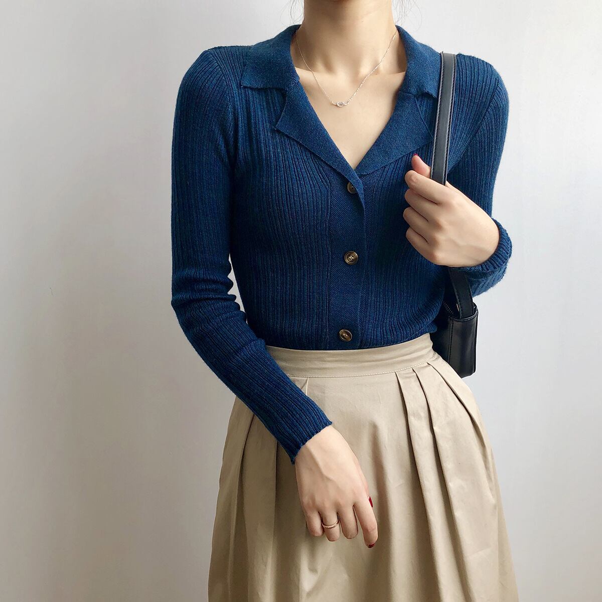 6色カラバリ、長袖襟付きリブニットカーディガン。