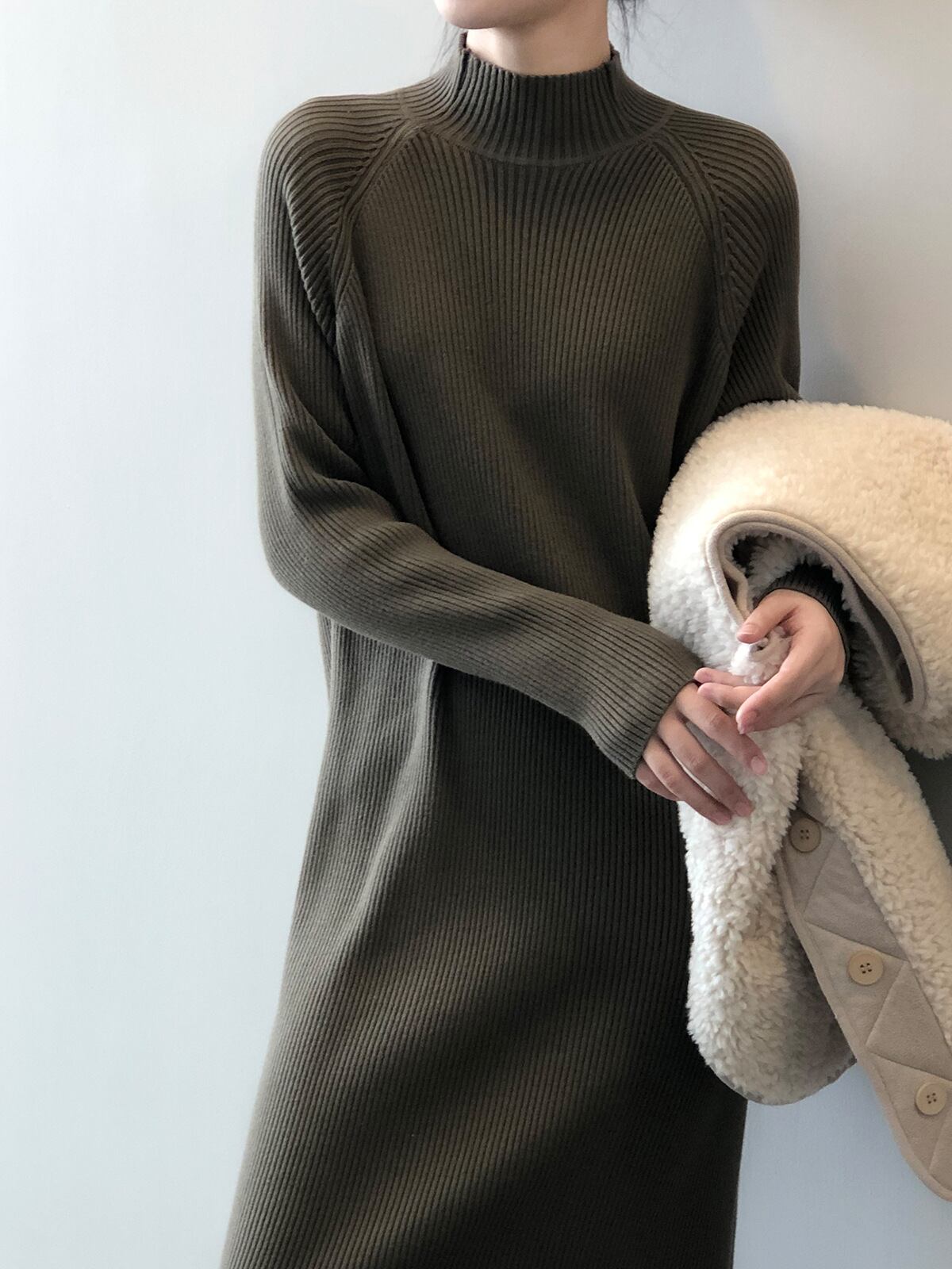 ワンピース レディース リブニットワンピース ミモレ丈 長袖 ハイネック ラグラン袖 Iライン ストレート 大人可愛い きれいめ シンプル ベーシック 大人 上品 おしゃれ お洒落 大人女子 エレガント フェミニン シック 存在感 こなれ感 抜け感 ワンサイズ フリーサイズ 黒 ブラック 白 アイボリー グレー 灰色 ブラウン 茶色 ダークカーキ 緑 無地 春 秋 冬 10代 20代 30代 40代 50代 60代 オフィス OL 通勤 学生 通学 デート お出かけ 女子会 休日 旅行 定番 モテ
