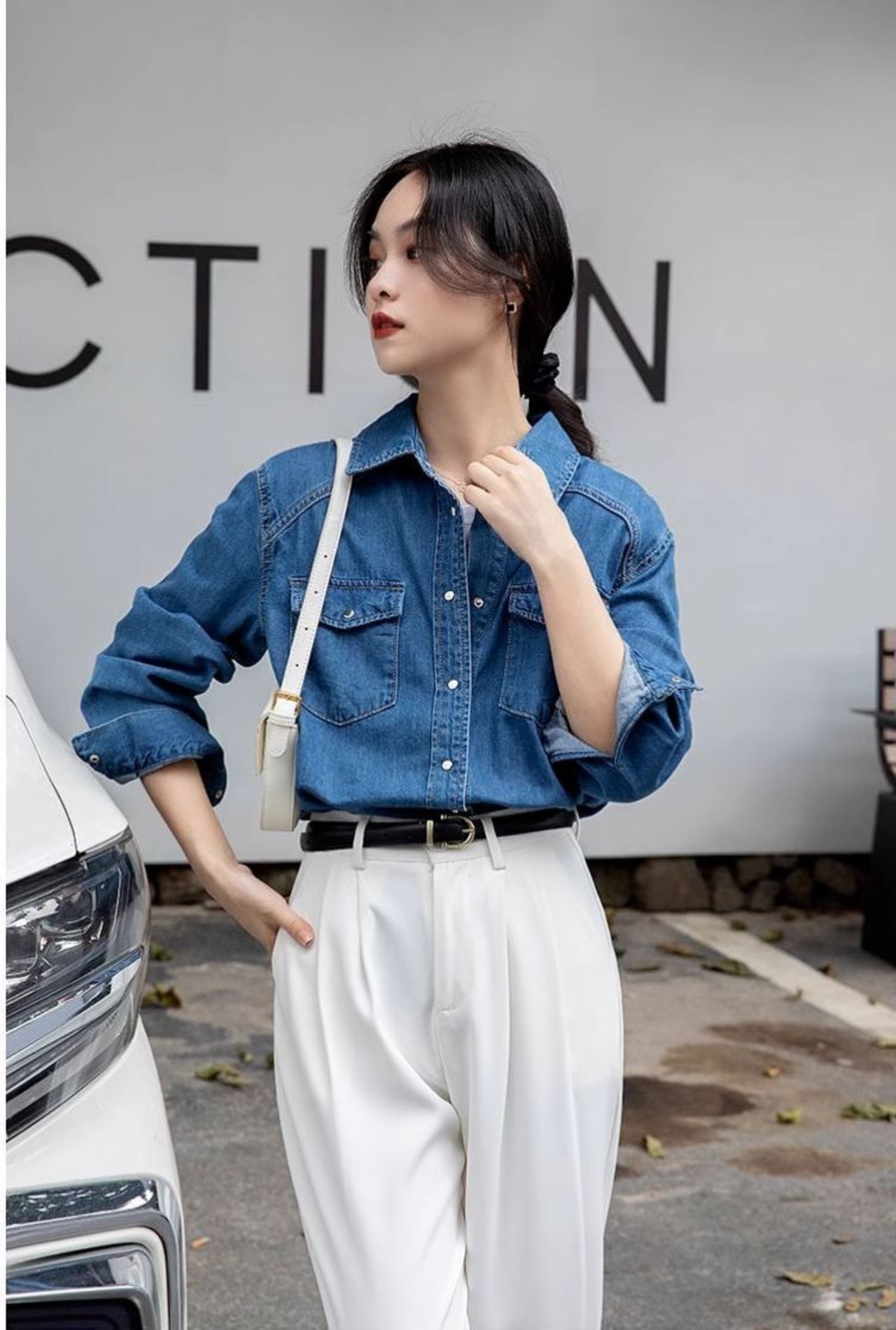 トップス アウター レディース デニムシャツ ブラウス 羽織り ジャケット 長袖 スナップボタン 襟付き ポケット 前開き ドロップショルダー 大人可愛い シンプル カジュアル ベーシック おしゃれ お洒落 かっこいい 大人女子 メンズライク ラフ こなれ感 存在感 抜け感 S M L XL ブルー 青 無地 春 秋 10代 20代 30代 40代 50代 60代 お出かけ 学生 通学 ママ 公園デビュー アウトドア 休日 旅行 普段使い デイリー 韓国 オルチャン 定番 楽ちん