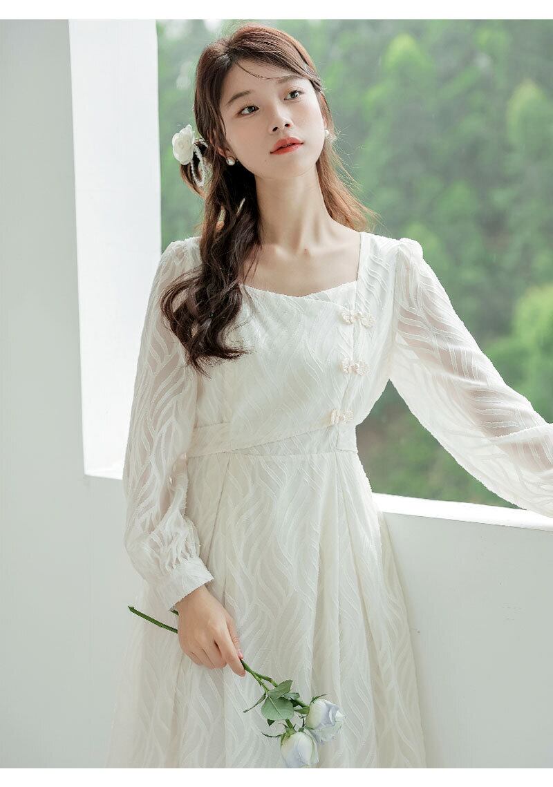 ワンピース レディース ロングワンピース 長袖 スクエアネック アジアンノット タックフレア Aライン レース 透け感 大人可愛い きれいめ シンプル シック 大人 上品 大人女子 おしゃれ お洒落 かっこいい エレガント フェミニン 清楚 こなれ感 抜け感 存在感 S M L アイボリー 白 春 秋 10代 20代 30代 40代 50代 デート 女子会 お出かけ 旅行 休日 韓国 オルチャン モテ ファッション コーデ スタイル プレゼント ギフト