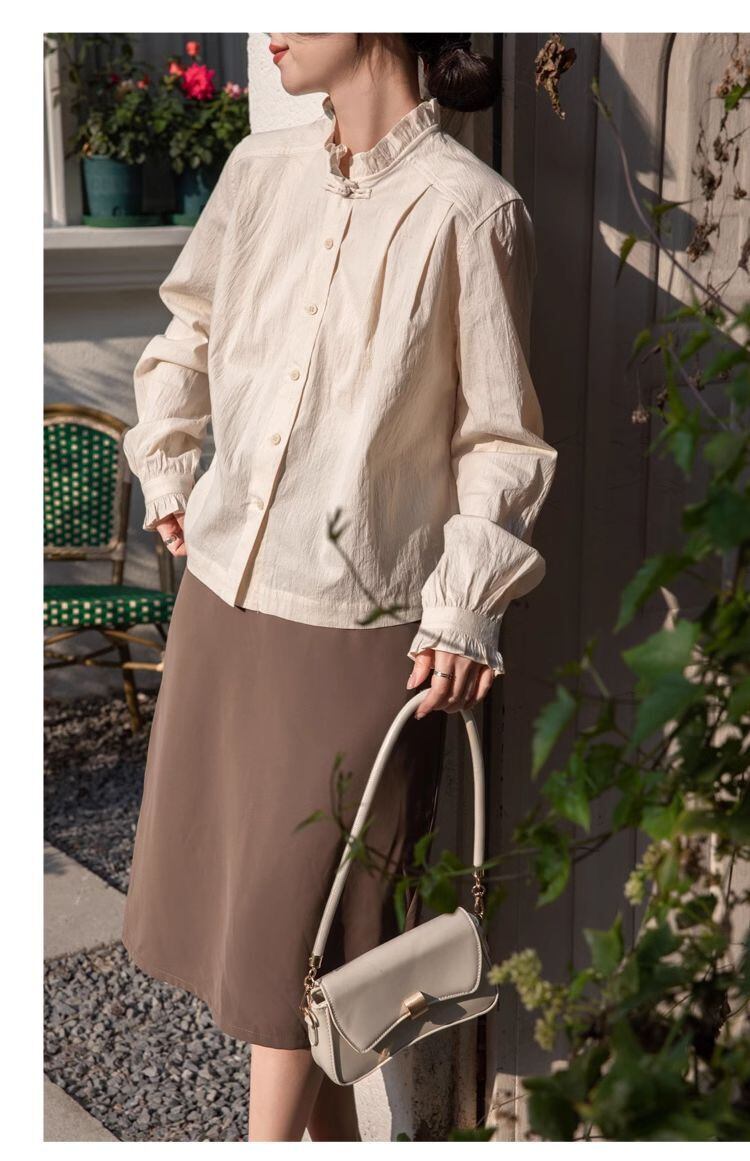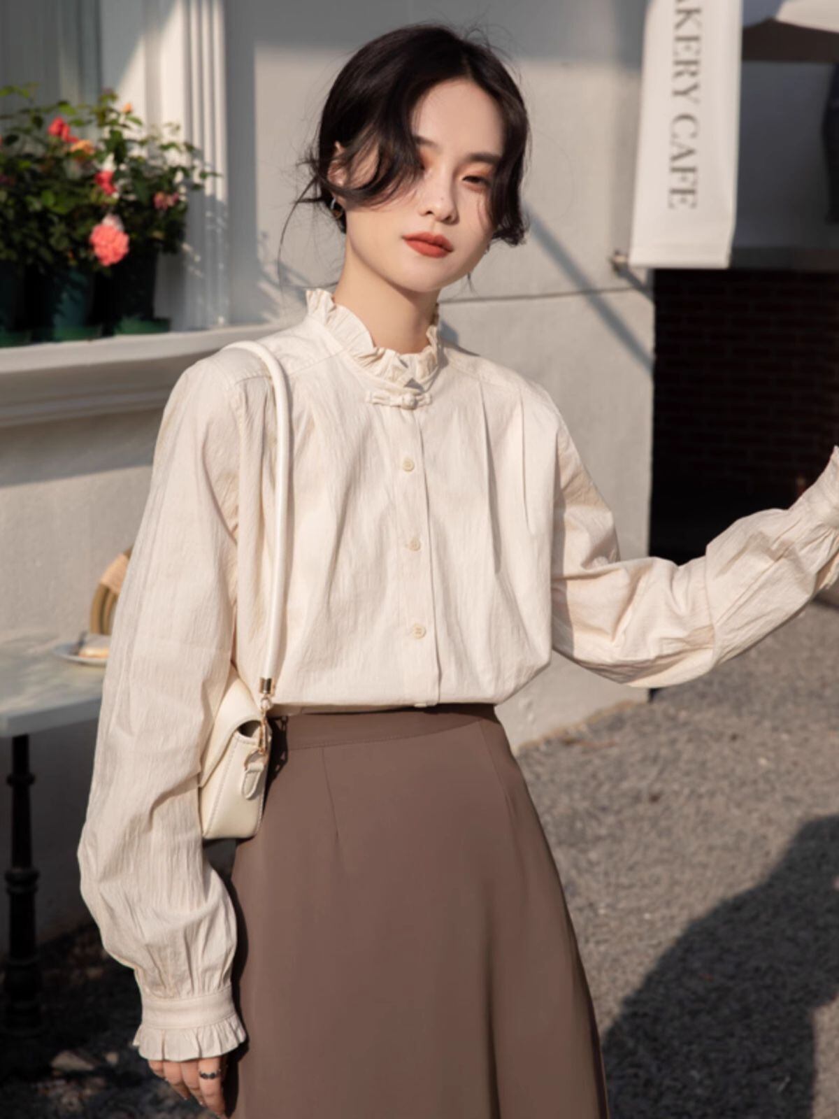 トップス レディース 長袖シャツブラウス 襟付き スタンドカラー 立襟 フリル襟 キャンディスリーブ タック アジアンノット 大人可愛い きれいめ シンプル シック 大人 上品 おしゃれ お洒落 かっこいい レトロ 大人女子 エレガント フェミニン 存在感 抜け感 こなれ感 とろみ感 S M L XL ピンクベージュ 無地 春 秋 10代 20代 30代 40代 50代 60代 ビジネス オフィス OL 通勤 通学 学生 お出かけ 女子会 デート 旅行 イベント 休日 重ね着 着回し 普段使い デイリー