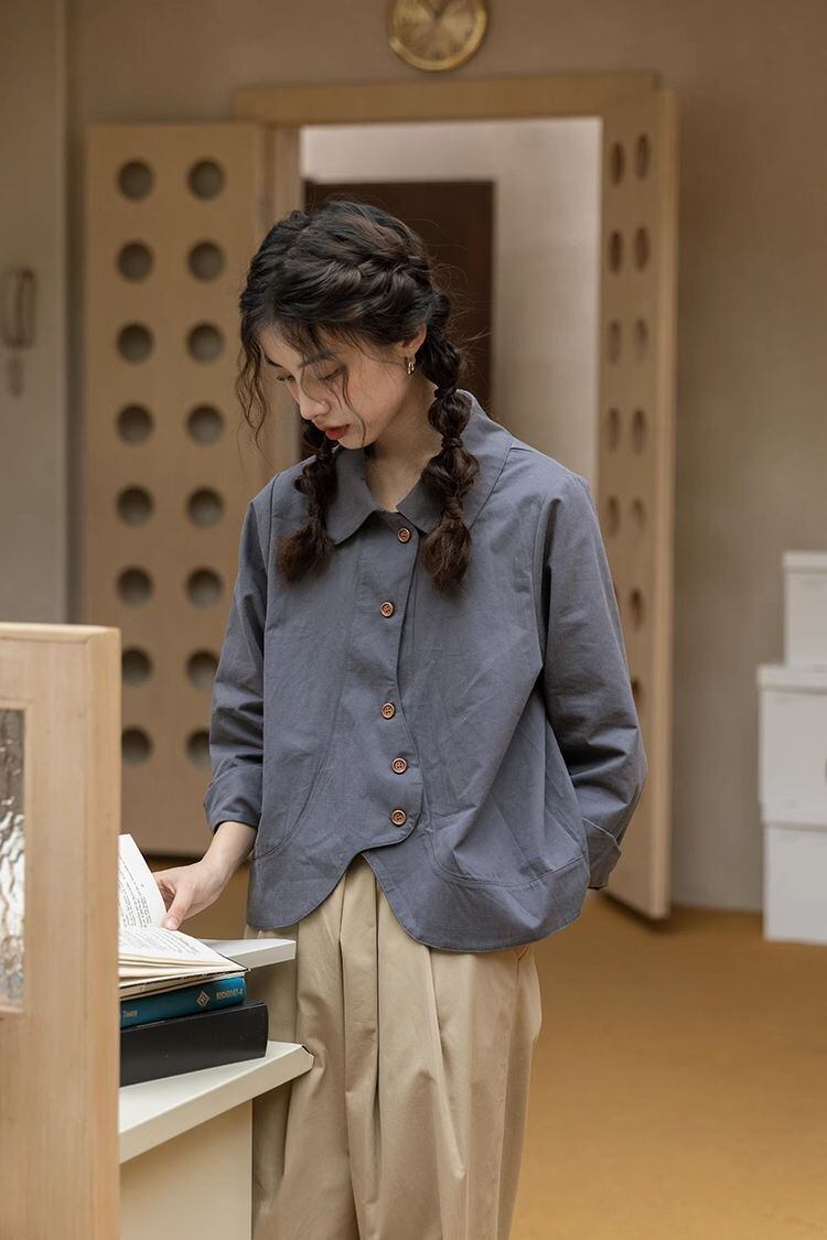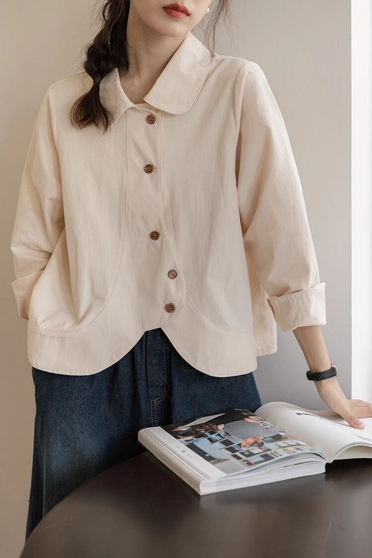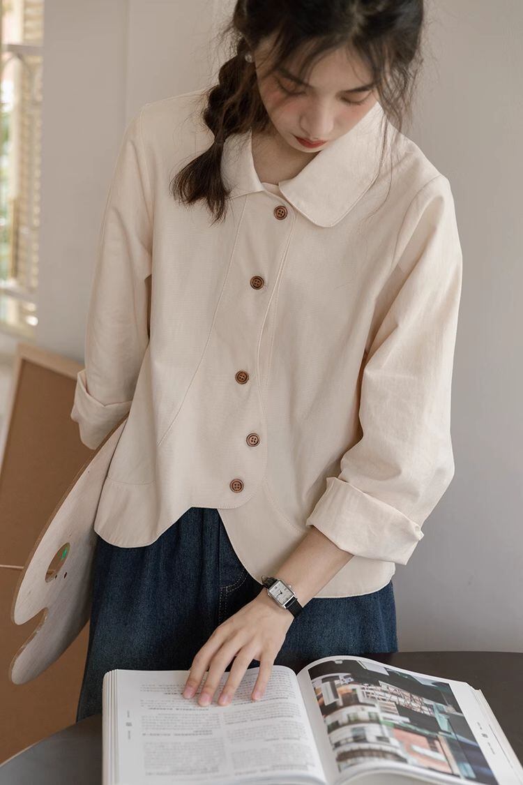 トップス レディース シャツブラウス 襟付き 長袖 アシンメトリー ボタン ハンカチヘム 大人可愛い シンプル カジュアル 大人 上品 おしゃれ お洒落 大人女子 レトロ 存在感 抜け感 こなれ感 S M L アイボリー 白 ブルーグレー 灰色 ブラウン 茶色 無地 春 夏 秋 10代 20代 30代 40代 50代 60代 ビジネス オフィス OL 通勤 通学 学生 ママ お出かけ 女子会 デート 旅行 リゾート イベント 休日 普段使い デイリー オルチャン 韓国 重ね着 着回し 楽ちん