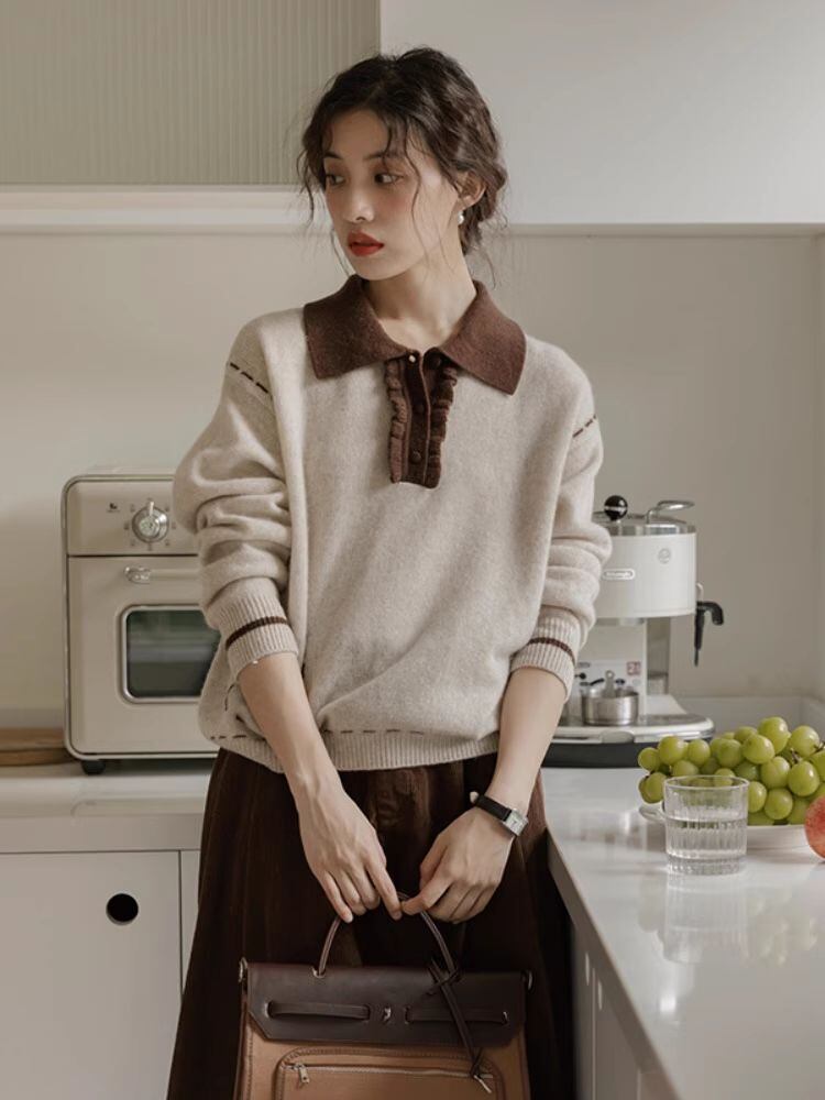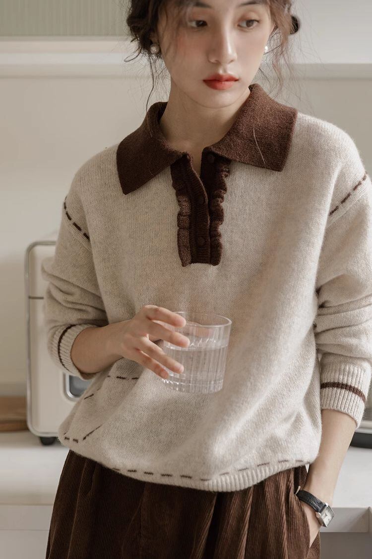 トップス レディース ポロニットセーター プルオーバー ポロ襟 長袖 バイカラー フリル ステッチ 大人可愛い シンプル カジュアル ベーシック ナチュラル おしゃれ お洒落 大人女子 上品 ほっこり ラフ こなれ感 抜け感 存在感 ワンサイズ フリーサイズ 白 アイボリー 無地 秋 冬 10代 20代 30代 40代 50代 60代 通勤 OL 通学 学生 ママ 公園デビュー アウトドア お出かけ 女子会 旅行 休日 普段使い デイリー 定番 あったか モテ 韓国 オルチャン 重ね着 着回し 暖かい