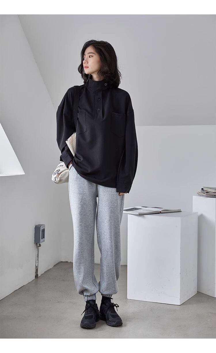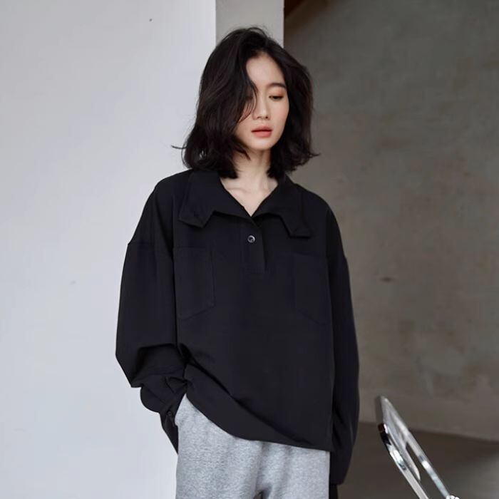 トップス レディース カットソー プルオーバー ロンT スタンドカラー 立襟 ボタン ビッグシルエット オーバーサイズ ドロップショルダー 長袖 胸ポケット 大人可愛い シンプル カジュアル おしゃれ お洒落 大人女子 メンズライク ボーイッシュ ルーズ ゆったり ゆる リラックス かっこいい こなれ感 存在感 抜け感 ワンサイズ 黒 無地 春 秋 10代 20代 30代 40代 50代 60代 学生 通学 ママ 公園デビュー アウトドア 旅行 普段使い デイリー お泊り ストリート