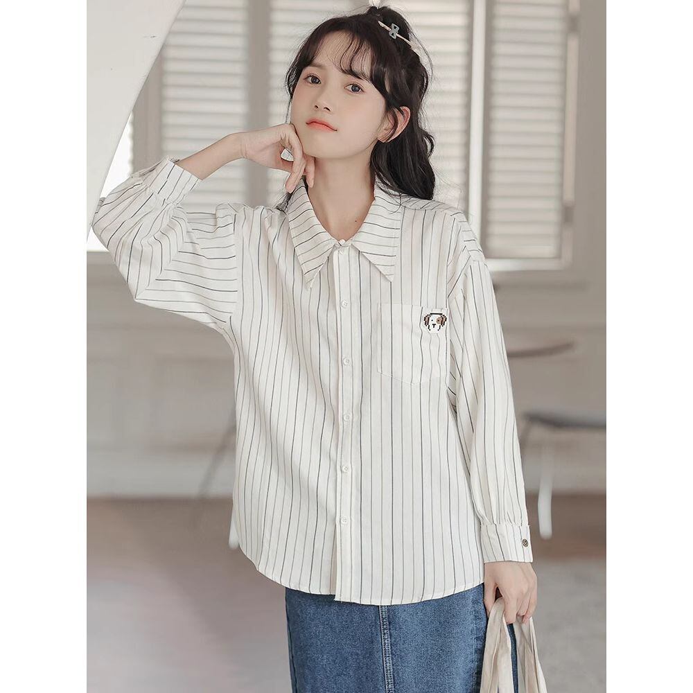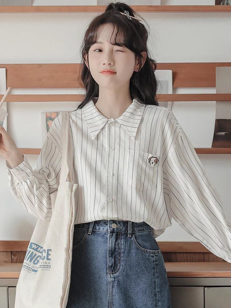 トップス レディース シャツ ブラウス 羽織り 長袖 日焼け防止 紫外線予防 冷房対策 長袖 ボタン 前開き 襟付き ドロップショルダー 胸ポケット 犬イラスト ワンポイント 大人可愛い おしゃれ お洒落 かっこいい きれいめ シンプル カジュアル ベーシック ゆる ゆったり ラフ ルーズシルエット 大人 上品 かっこいい メンズライク 存在感 抜け感 こなれ感 ワンサイズ 白 ホワイト ストライプ柄 縦縞柄 春 夏 秋 オフィス OL 通勤 お出かけ 学生 通学 女子会 旅行 普段使い デイリー