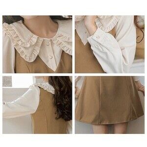ダブルフリルカラーの長袖シャツとVネックワンピの