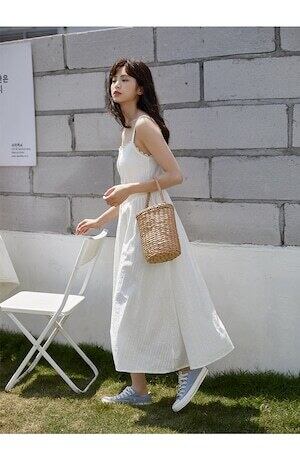 ホワイトカラーのミモレ丈キャミソールワンピース。