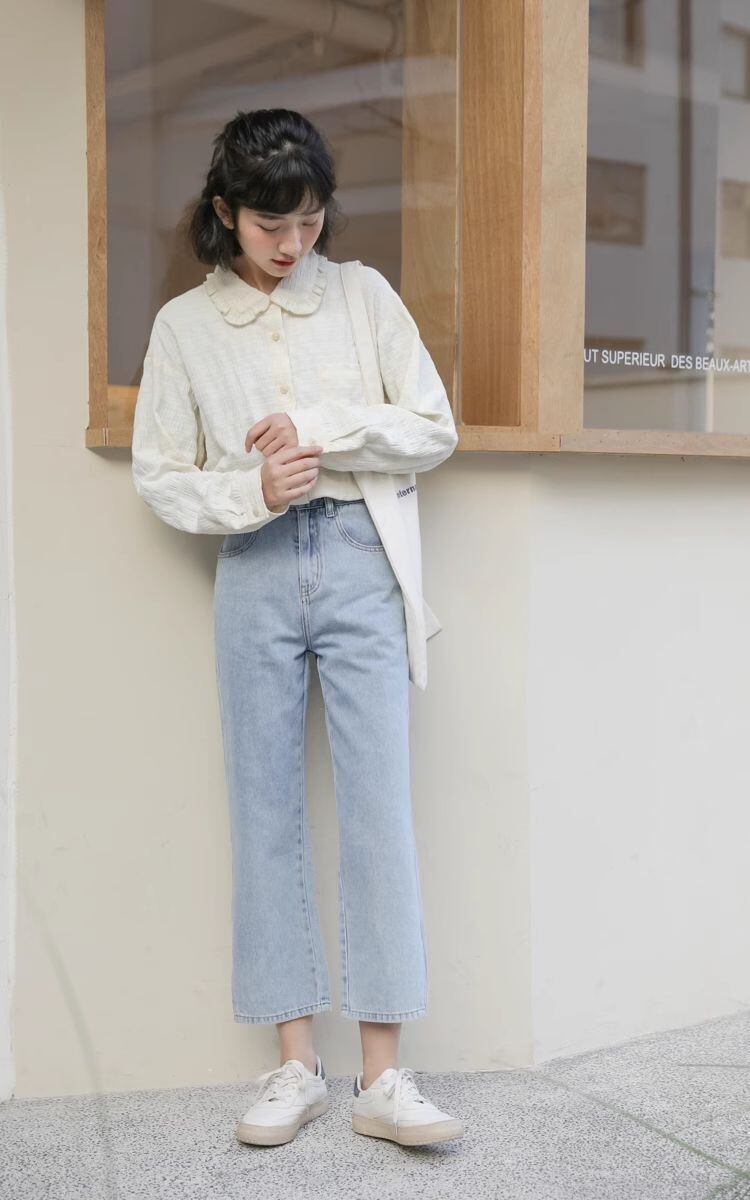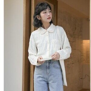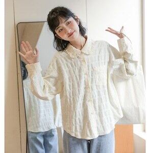アイボリーカラーのフリル襟長袖シャツブラウス。