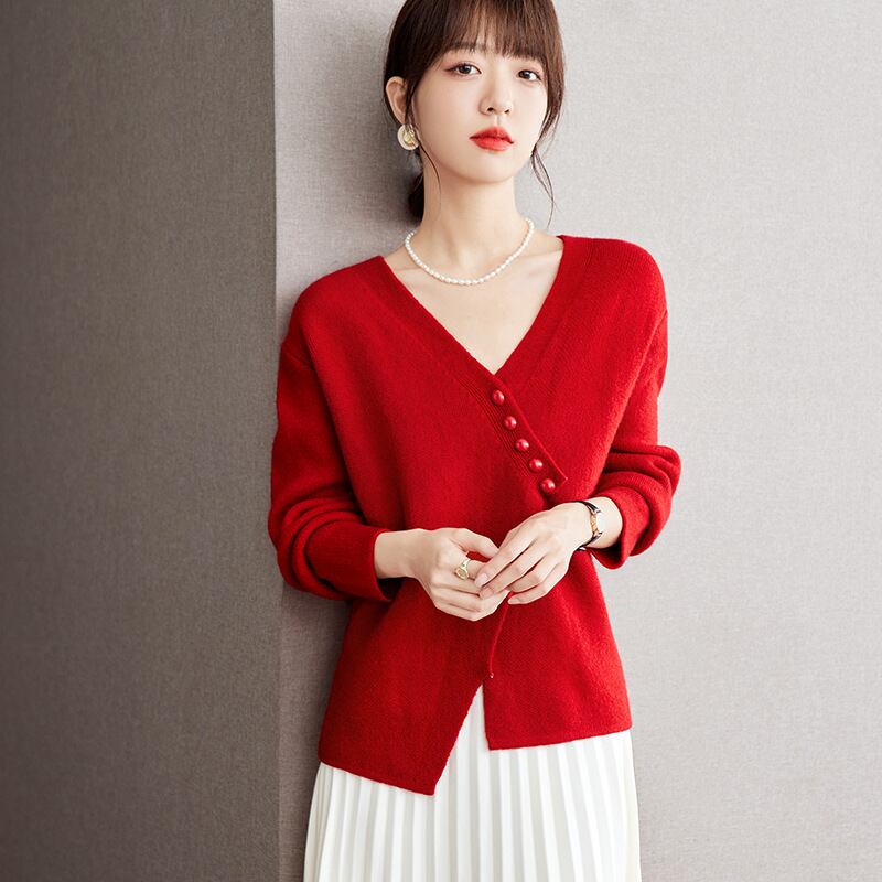 レッドカラーのアシンメトリーVネックニットセーター。