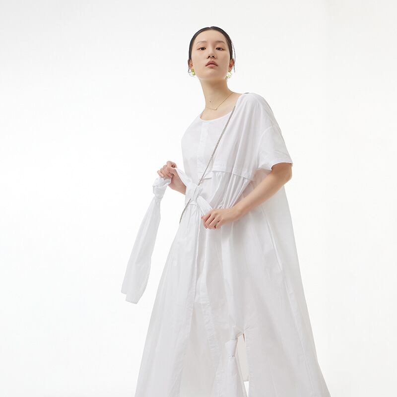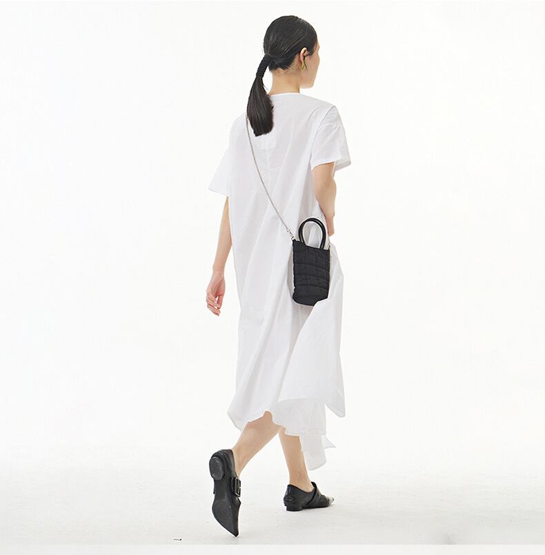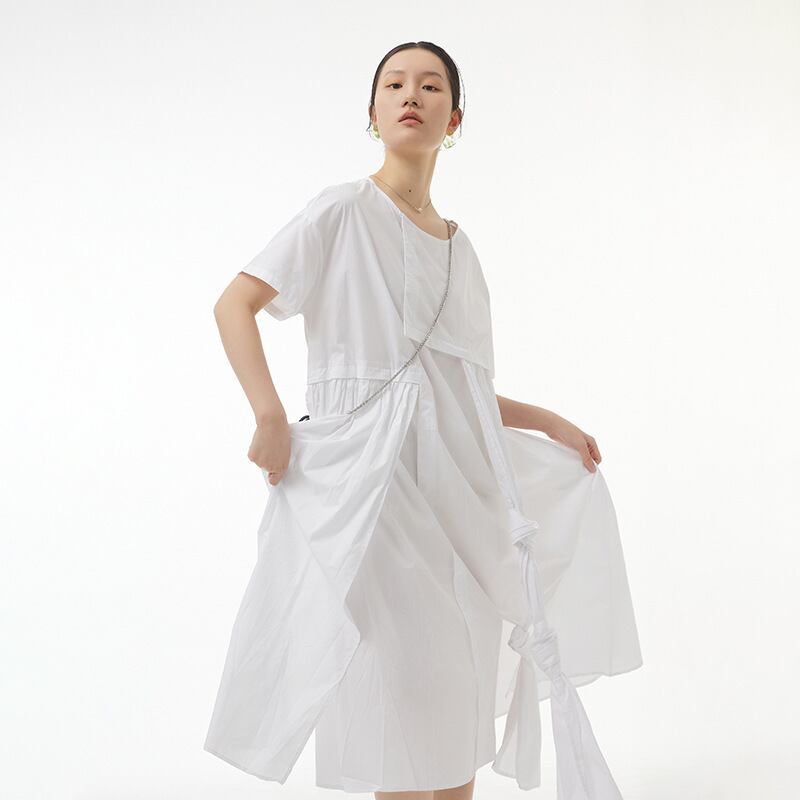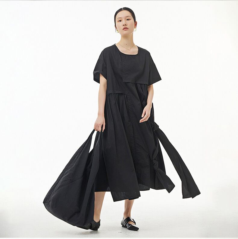 ワンピース レディース ワンピース ミモレ丈 半袖 クルーネック ラウンドネック 結び目 アシンメトリー アシメ ギャザー 大人可愛い ナチュラル シック 大人 おしゃれ お洒落 大人女子 かっこいい クール モード系 個性的 主役級 存在感 こなれ感 抜け感 ゆったり ゆる ワンサイズ フリーサイズ ブラック 黒 ホワイト 白 無地 春 夏 秋 10代 20代 30代 40代 50代 お出かけ 女子会 休日 旅行 パーティー イベント 韓国 オルチャン 普段使い デイリー 体型カバー ファッション