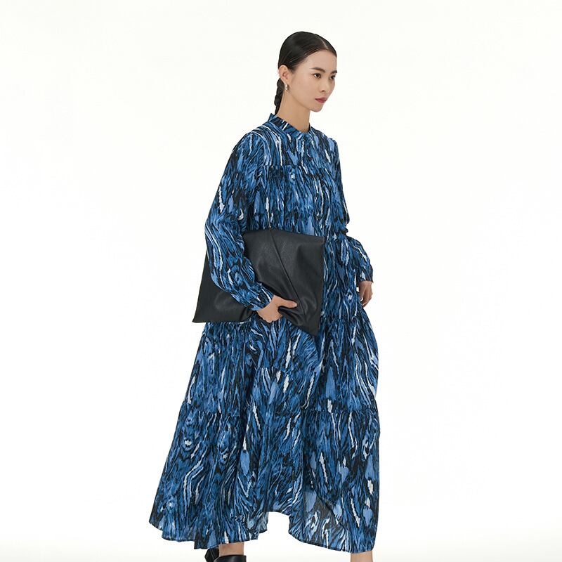 ワンピース レディース ティアードシャツワンピース 長袖 立襟 スタンドカラー ロング丈 ボタン 体型カバー マタニティ 妊婦 ドレープ ギャザー 大人可愛い シック きれいめ 大人 上品 大人女子 おしゃれ お洒落 かっこいい エスニック クール モード系 こなれ感 抜け感 存在感 ワンサイズ フリーサイズ グレー 灰色 ブルー 青 ブラウン 茶色 モザイク柄 春 秋 10代 20代 30代 40代 50代 60代 お出かけ 女子会 旅行 イベント リゾート デイリー 普段使い 楽ちん 韓国